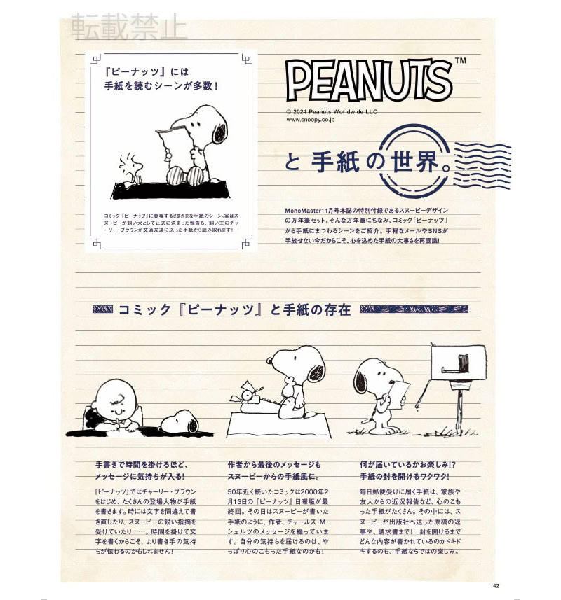 「付録の万年筆で気持ちを手紙に!」コミックPEANUTSと手紙の世界。『雑誌MonoMaster』