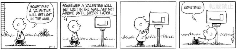 バレンタインの日は、気になる子に自分の気持ちを届けるためメッセージカードを渡す習慣が。誰だって気持ちのこもったカードが1枚でも届いたら嬉しいもの! そんなイベント当日、ポストの前で心待ちにするチャーリー・ブラウンですが、なかなか郵便は届かず......!