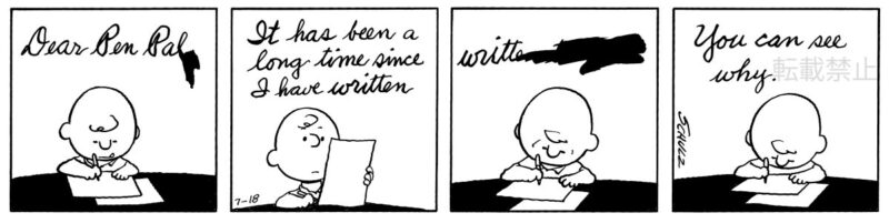 コミックの中で度々登場するのが、チャーリー・ブラウンの文通友達(ペン・パル)。最後の1文でわかるように、まだ彼は手紙に書き慣れていない様子。インクがはみ出したり、文字を書き間違えていたり、何を書こうか悩んだり、手書きの文章は素直に自分が現れる証拠かも。