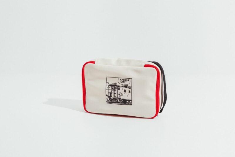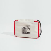 企画展「旅するピーナッツ。」のメインビジュアルがデザインされた、シンプルで使いやすいトラベルポーチ。