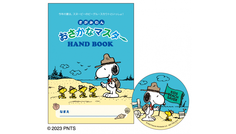 今回の「PEANUTS」と「ブルーサンタ」のコラボはごみ拾いイベントだけではありません。江の島海水浴場片瀬東浜海岸に期間限定で登場する、子ども向けの船のアスレチック「ちびっこ BEACH SAVER パーク」( 開催期間7月1日(土)~9月3日(日) )では、「ビーグル・スカウト」デザインの「おさかなマスターハンドブック」が登場。「おさかなマスターハンドブック」は海離れが加速している子どもたちに、海への興味関心を持ってもらうために作られた小冊子。おさかなクイズをしながら、スタンプを全部集めるとオリジナルのステッカーがもらえるのですが、今年は小冊子とステッカーが、来年50 周年を迎える、「ビーグル・スカウト」デザインに。