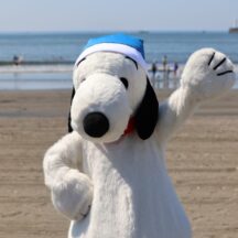 スヌーピーも海岸のごみ拾いに参加しました。おそろいの青い帽子をかぶって、子どもたちと一緒に。