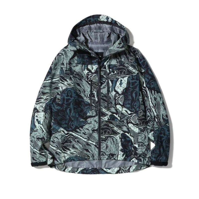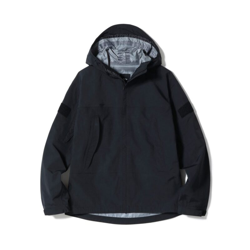 防水性を高めるべく縫製は最小限にし、立体裁断による無駄のないフォルムを採用することで運動性能を高めたハードシェル。ナイロンタッサー生地を基にナイロントリコットフィルムで製作された3層構造の生地を用い、透湿性10000g・耐水圧10000mmを実現する。止水ファスナーはレーザーカット後に圧着するなど細部も拘りが満載。