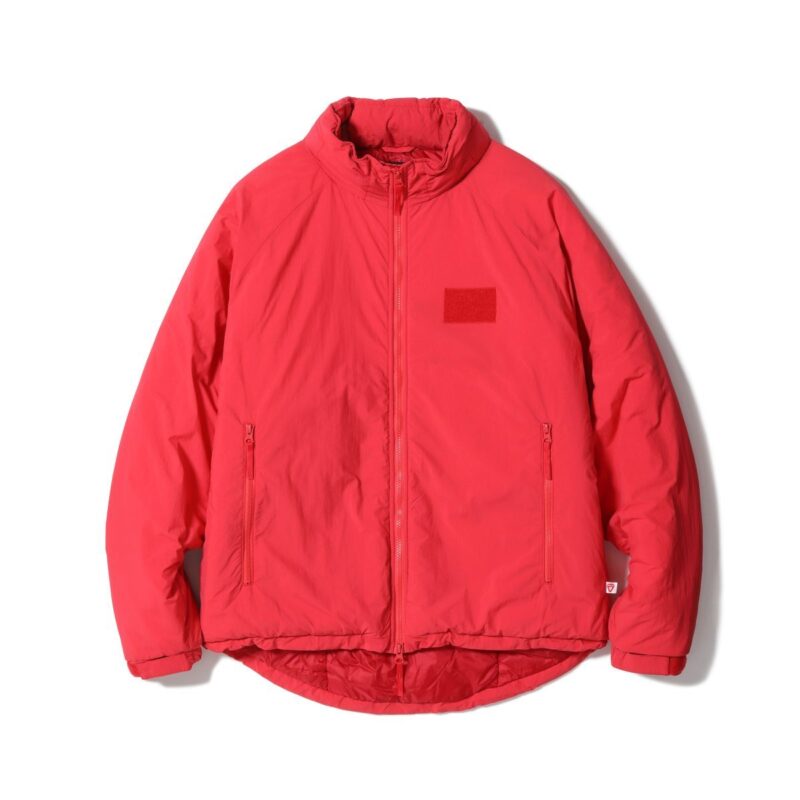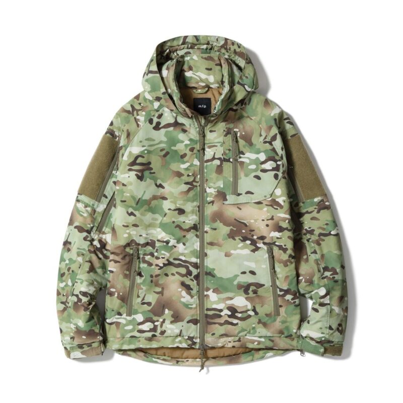 米軍が採用するレイヤリングシステムECWCSのレベル7アウターがモチーフで、その中でも海兵隊に支給される通称ハッピースーツを基に製作された一着。撥水加工済みのナイロンタスラン生地のシェルに、中綿にはプリマロフトを200g/㎡内包し、優れた保温性能を持つ。スタンドカラーの内部には大型のフードも収納されている。