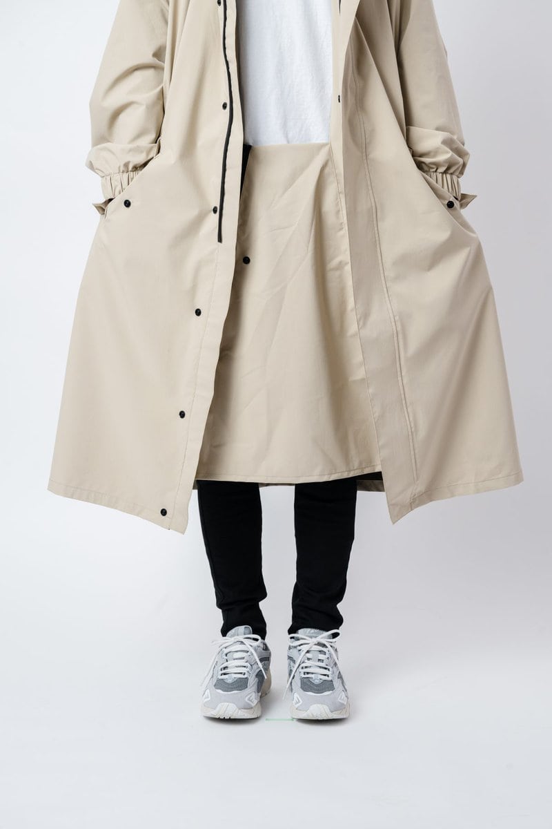 「サイクルモードレインコートEX」の前裾部分には、ジッパー開閉式の三角マチを搭載。これは、雨の日に自転車を運転する際、下半身への雨の侵入を防ぎ、風によるバタつきも抑制するもの。快適性と安全性が同時に増す機能です。