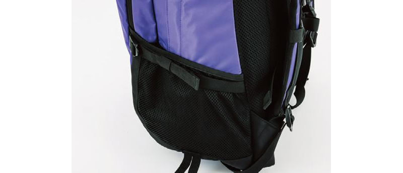 両サイドに500mlサイズのペットボトルが収納できるベルト付きメッシュポケットを装備。