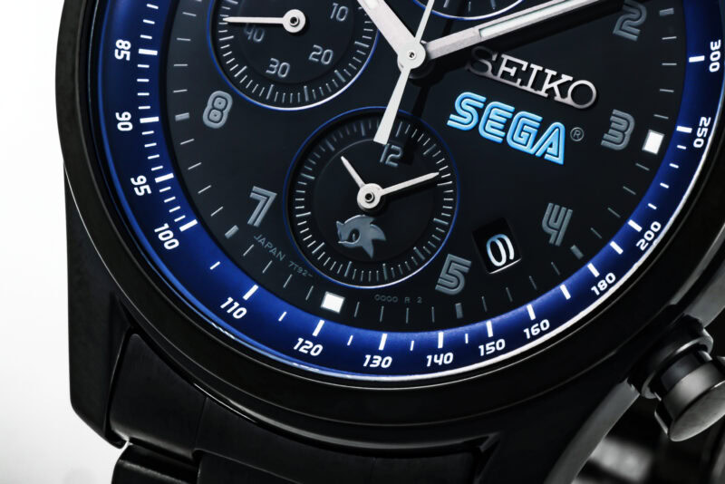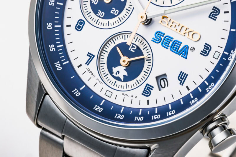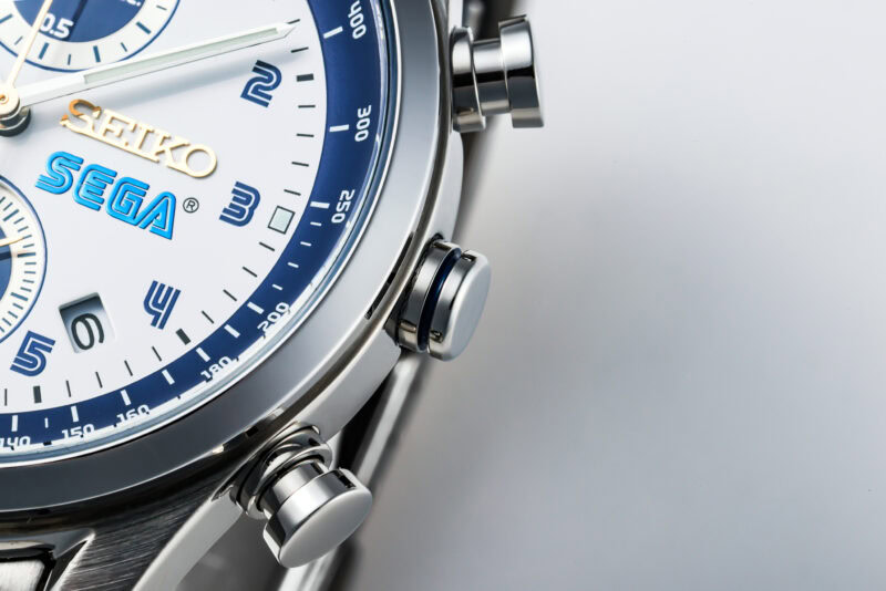このこだわりの腕時計のインデックスは、セガオリジナルフォントのアラビア数字が採用されていることにお気づきでしょうか。さらに、3時位置にはセガロゴ、6時位置のサブダイヤルには「ソニック」があしらわられています。インデックスの視認性もよく、さりげなく配置された「ソニック」もスタイリッシュ。ビジネスシーンでも活躍しそうです。