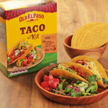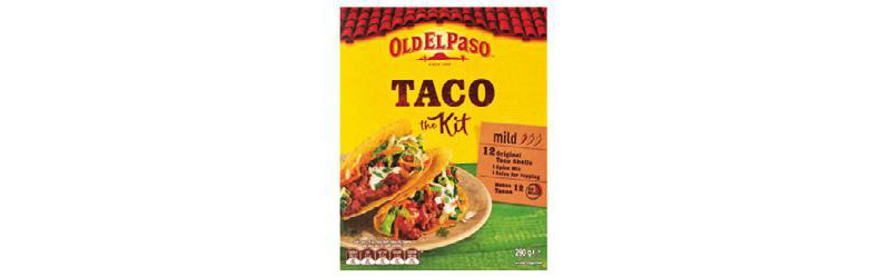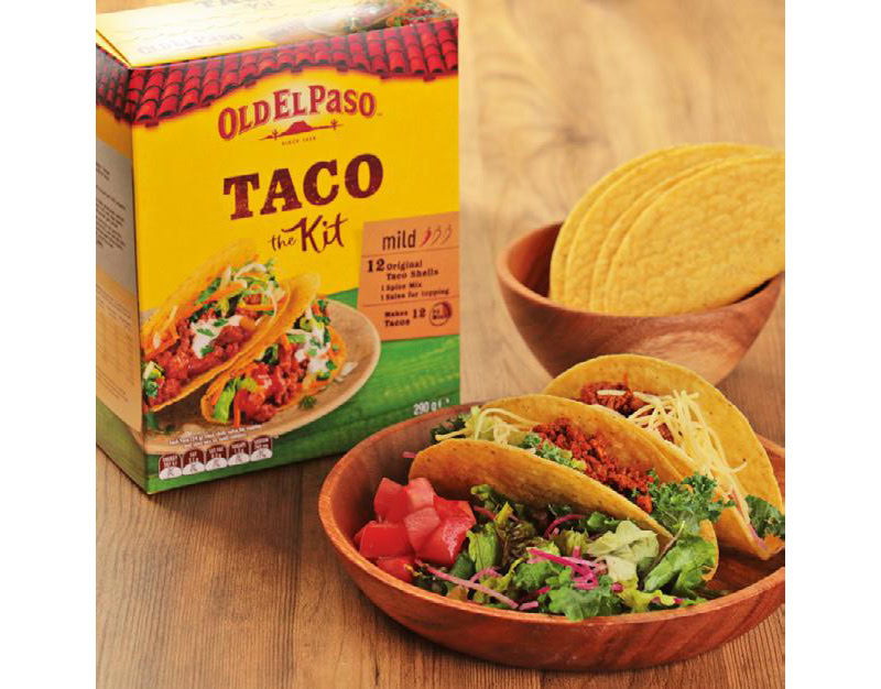 とうもろこし粉で作られたハードタイプのタコスの皮12個とひき肉用のシーズニングミックス、ソースが入ったタコキット。皮をオーブントースターで温めると一層パリッとした食感に。