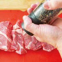 1. かすを作る。下茹でしてある牛の直腸を小さく切る。揚げるのに時間もかかり、油の飛び跳ねなどの処理も大変だけれど、脂肪たっぷりの生の小腸などが手に入ればより一層おいしく仕上がる。