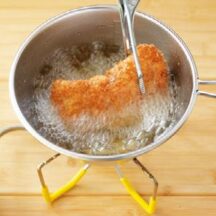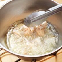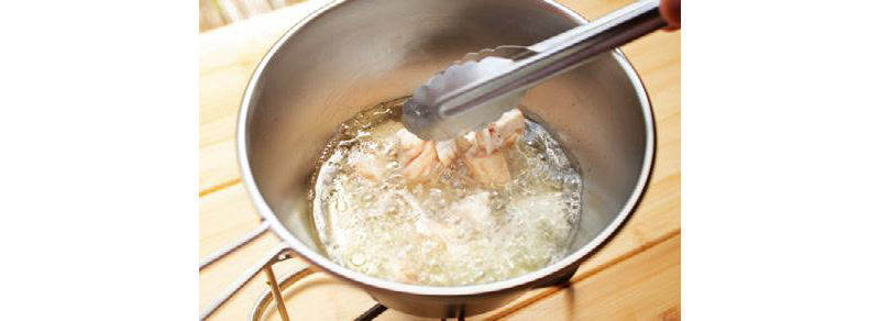 2. シェラカップに底から1センチくらいに油を注ぎ、バーナーで加熱。油が温まったら腸を揚げる。身から余分な油分が抜けてカリッとなるまで、中火でじっくり時間をかけて揚げる。