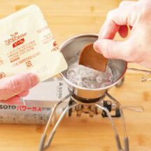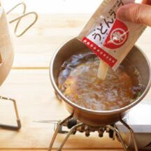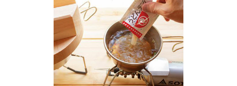 3. シェラカップでうどんを茹でるお湯を沸かす。同時にスープ用の湯も別に沸かす