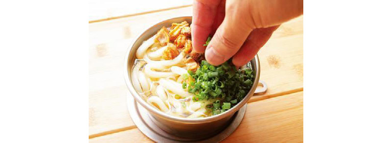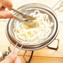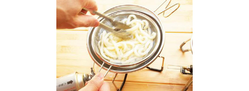 6. うどんを湯上げし、別のシェラカップに入れる。