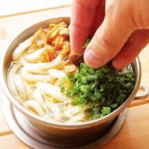 7. スープを入れ、かす、小ネギ、とろろ昆布をトッピング。