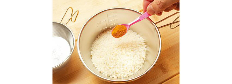 1. 無洗米にウコンの粉末を加え、ごはんを炊く。アウトドアでの無洗米の使用は、水も汚さないので合理的。
