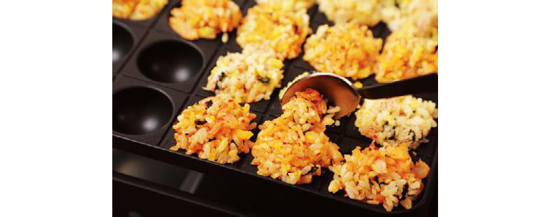ごはんをこんもりとのせるのが丸く仕上げるコツ。スプーンでギュッと押し込んだら転がし、また押し込んで転がすを繰り返す。おこげが少しできるくらいカリッと焼くとおいしい。