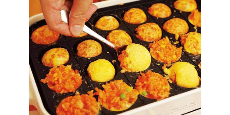 3. 弱火にしたたこ焼き器に2を入れ、上からスプーンでチキンライスを盛る。