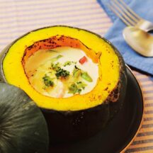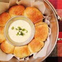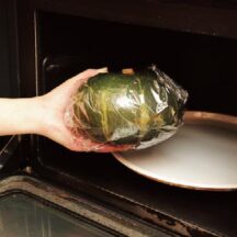 8. 少しずらしてダッチオーブンにフタをし、フタの上にたっぷりの炭をのせ、焦げ目がつくまで焼く。家庭の場合は200℃のオーブンで15~20分焼く。