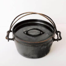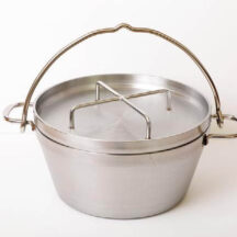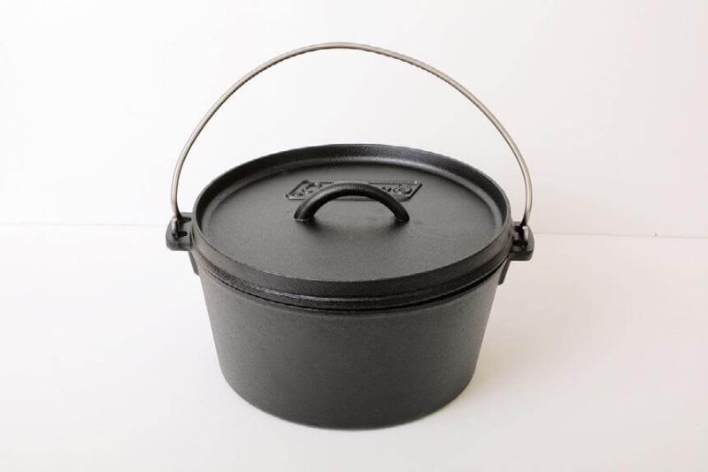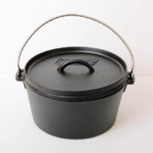 王道の鋳鉄製ダッチオーブンは脚なしで家庭のキッチンでも使え、植物性オイル仕上げだからシーズニング不要ですぐに調理が始められる。リッドリフター、ボトムプレート、収納ケースが付属。満水容量4.2L、約φ23.5×H11cm
