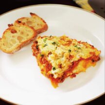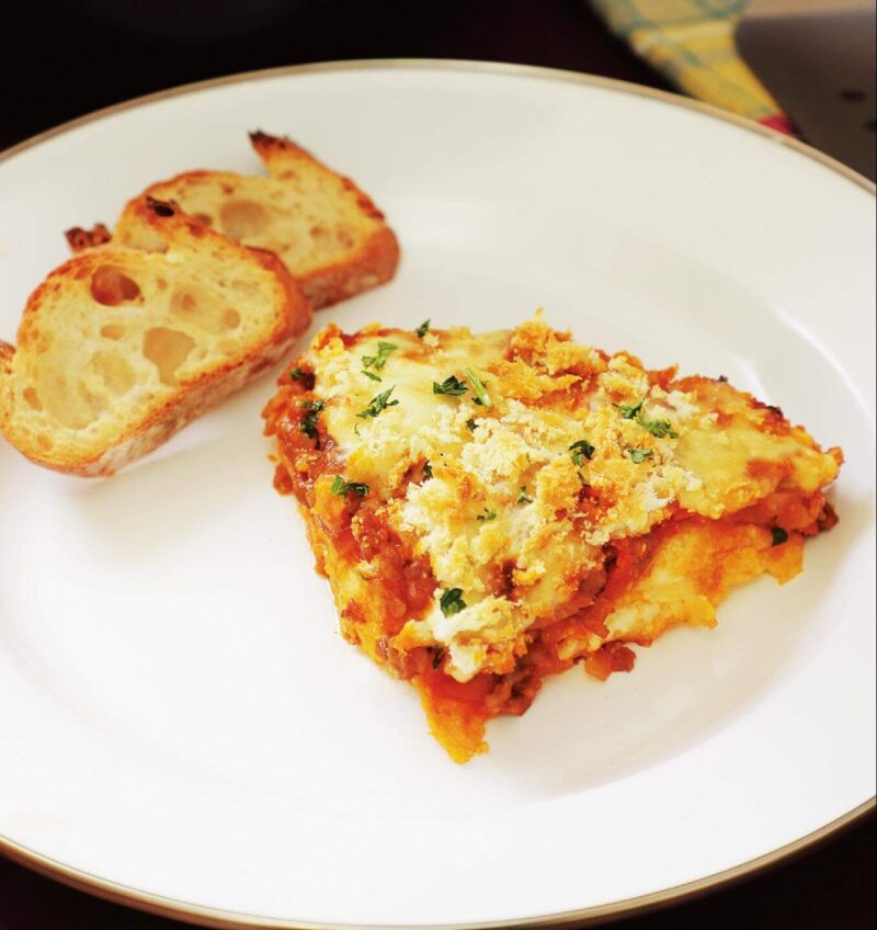 ごちそう感たっぷりのラザニアはダッチオーブンひとつで完結。アウトドアでは作るのが難しいベシャメルソースをスキムミルクで代用することで、サッと手軽に作るのが田中さん流。キャンプでは炭火で、おうちではオーブンでどうぞ。