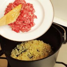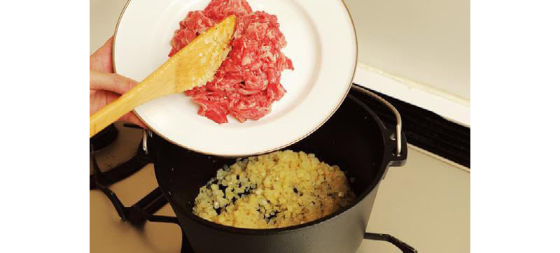 1. 最初にボロネーゼを作る。ダッチオーブンにオリーブオイルとバターを入れ、大きめのみじん切りにした玉ねぎ、セロリ、ニンニクを玉ねぎがしんなりするまで炒める。