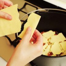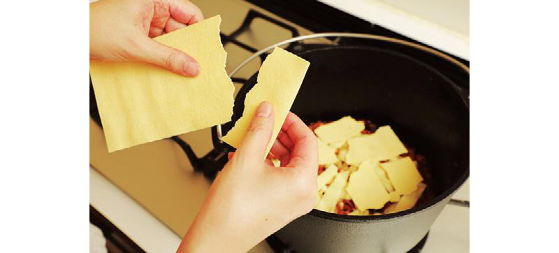 ポイント② 完成後に切り分けやすくするため、ラザニアは手でバリバリと割りながら敷き詰めるのがポイント。下茹で不要タイプのラザニアならアウトドアでも作りやすく、コツいらずでできる。