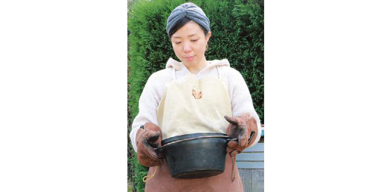 9. 焚き火台(熾おきび火になった炭)にダッチオーブンをのせ、フタの上にも熾火になった炭を置き、10~15分焼く。家庭の場合は、180℃のオーブンで15~20分焼く。よい色に焼き上がったらパンが完成。