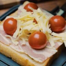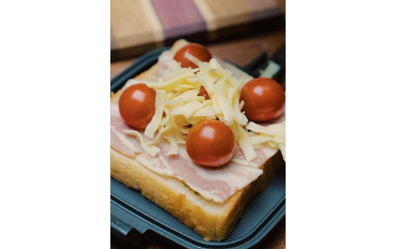 2. ベーコン、ミニトマト、チーズをのせ、食パンで挟む。