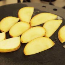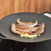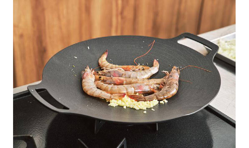 2. マルチグリドルにオリーブオイル大さじ2を入れて弱火にかけ、ニンニクに香りが出るまで炒める。ニンニクの香りが出たら端に寄せておく。