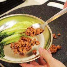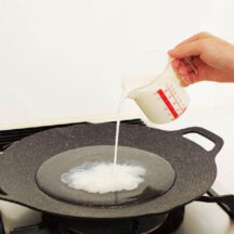 4. 中火にし、生米とオリーブオイル大さじ2を入れ、軽く炒めて油をなじませる。