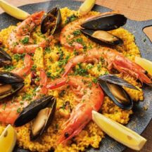 6. 水気が飛び、ごはんが程よい固さになったらエビとムール貝を交互にのせる。刻んだパセリを散らし、レモンを添える。