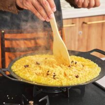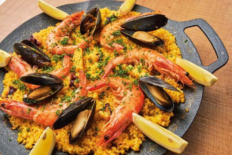 ポイント① パエリアのおいしさのポイントは、魚介の旨味をスープに閉じ込めること。最初に野菜と魚介を炒めて味を引き出すのもポイントのひとつ。旨味たっぷりのスープを米が吸っておいしく仕上がるのだ。