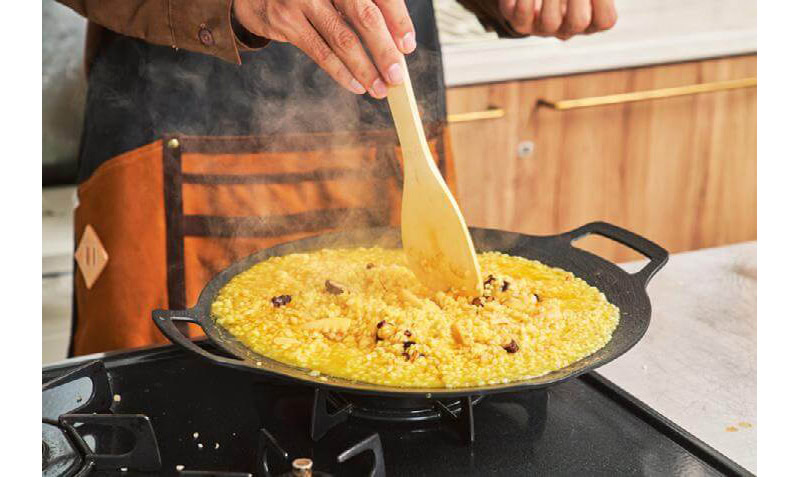 ポイント② 木べらでかき混ぜながら米を炊くのが、鍋底へのくっつきを回避するコツ。魚介の旨味が溶け出したスープを米にしっかりと吸わせていく。水分を蒸発させながら加熱することで、うまみも凝縮される。