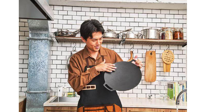 「最初にマルチグリドルを知ったのは2年ほど前。実は、友だちが『コレ流行ってるんだ』とキャンプに持ってきていて知ったんです。油がいらない、焦げ付かない鉄板なんだというのをプレゼンされながらも、そんなわけあるかって思っていたんです(笑)。でも実際に使ってみたら、本当にひっつかない! 油いらずでも使えるのが画期的でびっくりしましたね。しかも、ひっつかないから水だけでもサッと汚れが落ちて、片付けが簡単なんです。キャンプやBBQで人気の鉄板料理ですが、いわゆる鉄板は重くて持って行くのが大変。でもマルチグリドルなら軽いから、本当にラクなんです。焚き火もガスもIHもOKで、自宅でも活躍しますよ」