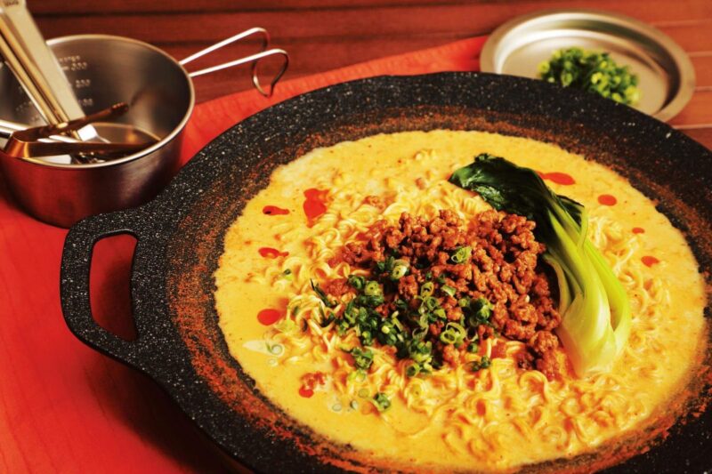 深さのあるマルチグリドルならラーメンだって余裕。手が込んでいるように見える担々麺は、実はインスタントラーメンを使ったお手軽アレンジメニュー。しかも絵力も抜群です! 辛いインスタントラーメンのスープを、水と牛乳を1:1の割合にすることでまろやかな味わいに。