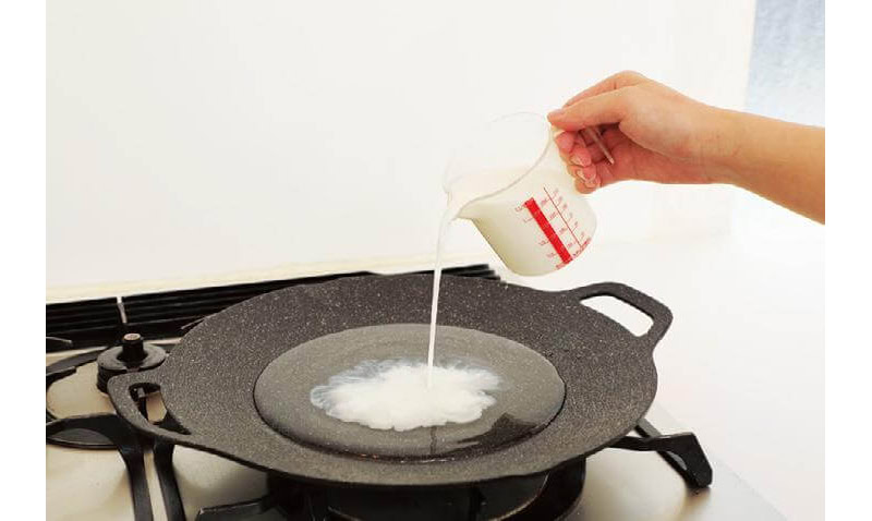 3. 空いたマルチグリドルに、インスタントラーメンのパッケージ記載分量の半分の水と、水と同量の牛乳、付属のスープを入れて火にかける。
