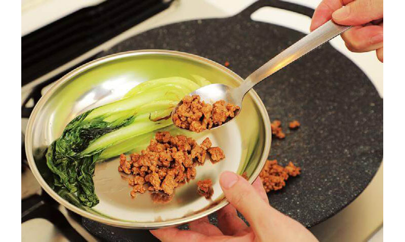 1. マルチグリドルにごま油をひき、中火で豚ひき肉とチンゲン菜を炒める。