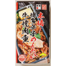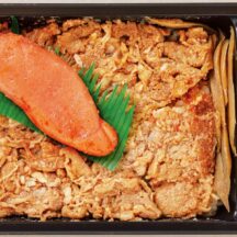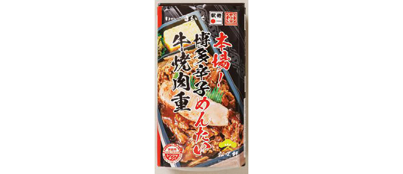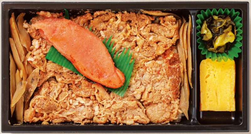 スパイスの利いた焼肉に仕上げた牛肉をご飯のうえに敷き詰め、本場「まるいち」謹製の博多辛子めんたいを丸ごと1本豪快に盛り付けたインパクトのある駅弁。
