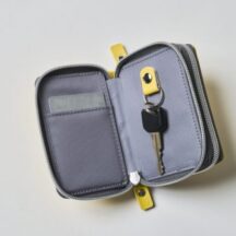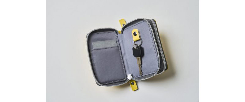 カギが簡単に取り外せる、スナップボタン式のキーホルダーと、交通系ICカードサイズのポケットを付属!
