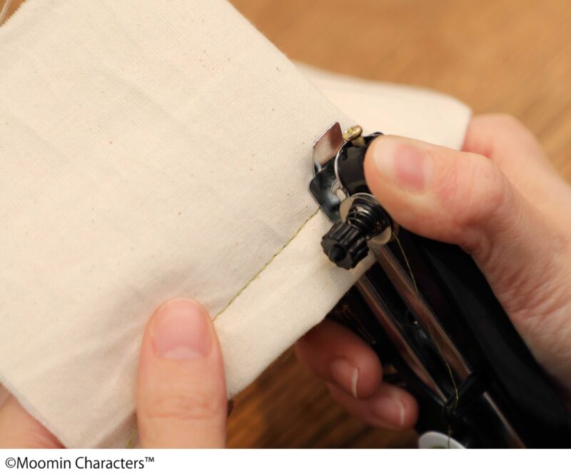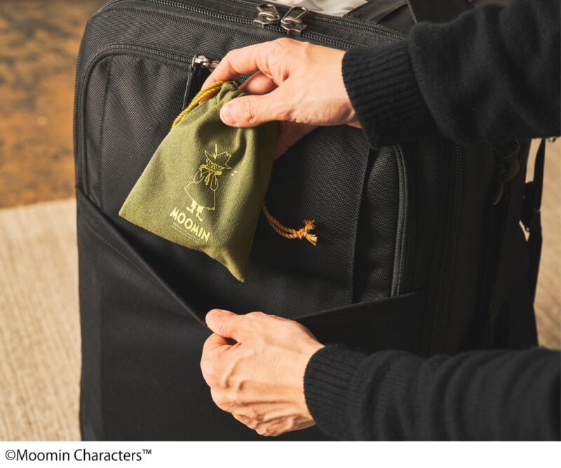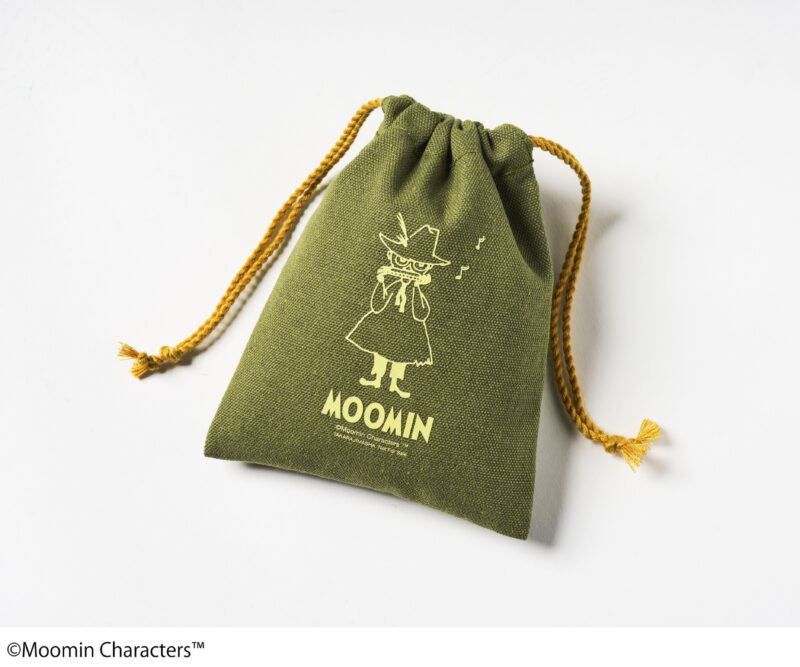スナフキンのデザインがされた収納用の巾着に、ハンディ・ミシンや糸切はさみなどを収納できます。グリーンの生地の巾着はヴィンテージライクなデザイン。