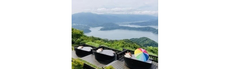 石川県では、北陸随一の渓谷美を誇る山中温泉・鶴仙渓の名物「川床」で加賀棒茶。富山県では、県内屈指の絶景スポットである「雨晴海岸」のそばにある道の駅で人気のドリンク「サラトガクーラー《雨晴ver》」(写真下)。福井県では、神秘の湖「三方五胡」や日本海、城山などの山並みを望む「レインボーライン山頂公園」(写真上)でレインボーソフトを提供しています。