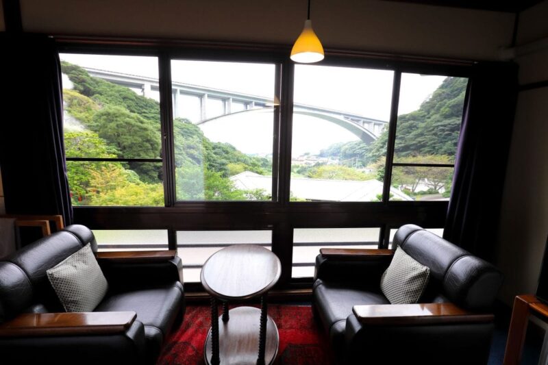 岡本屋の客室からは、豊かな自然と、迫力満点の大きな橋がのぞめる。