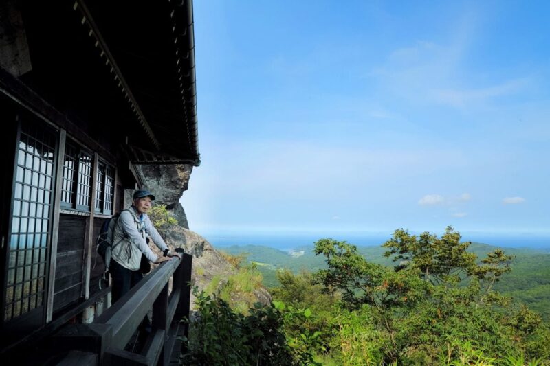 不動明王が祀られた御堂からは、小門山や両子山などの山々を眼下に、姫島や瀬戸内海の島々を見渡せる。