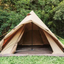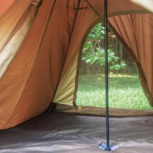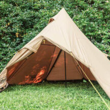 メインポール1本とフロントポール1本で立ち上げるティピー型テントは、ひとりで素早く設営できる。フライにはコットンのようなナチュラルな風合いのテックスファイバーを使用し、撥水性能に優れたテフロンコーティングも施される。インナーテントは標準装備。フライシートだけで立ち上げれば、デイキャンプなどでも活躍する。重量約6.6kg、使用サイズW385×H200×D325cm
