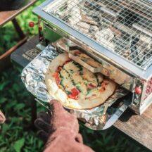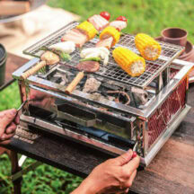 こちらのモデルは立って調理する従来のグリルと違い、テーブルの上に設置して座ったまま調理できるのが楽ちん。ロストル(炭を入れるトレー)の下が冷凍ピザやトーストを焼ける簡易グリルになっている点も画期的だ。さらに、焼き網の高さを変えて火力をコントロールできる点や、焼き網に食材をのせたままロストルを引き出して、炭の継ぎ足しができる点も実用的で超便利。コンパクトなサイズ感もソロからデュオキャンプにぴったりだ。