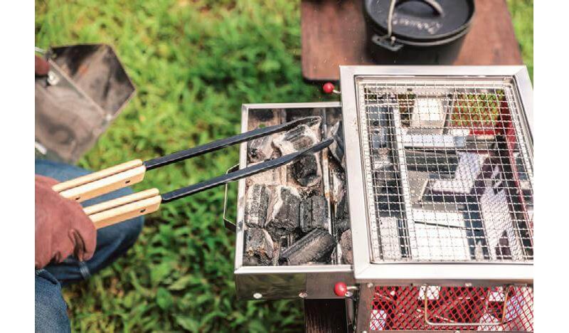 ロストルは引き出し式になっており、焼き網をのせたまま炭の追加や交換ができる。