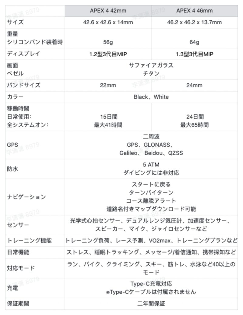 グレード5チタンベゼル、傷をつきにくいサファイアガラス、本体とバンドとの接合部が強化され頑丈かつ軽量で快適なフィット感を実現。常時オンのディスプレイは太陽光・雪中・日陰の下でも優れた視認性を発揮し、全衛星システムGPSモードで46mmモデルは最大65時間、42mmモデルは最大41時間のロングバッテリーを実現しています。
