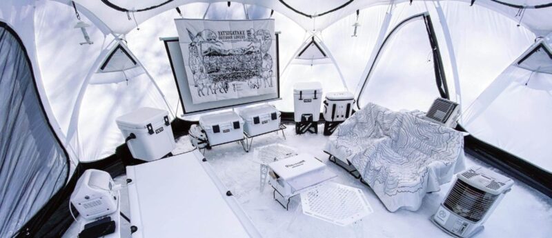 「限定でリリースされたザ・ノース・フェイスの白いVE25はおそらく日本にはこのひと張りしか存在しないかもしれません。キャンプ場選びの基準は芝生がキレイで、とにかく広いサイト。でもシーズンオフはないので、雪上でキャンプをすることも。冬キャンでは寝袋とマットが大事なので特にお金をかけ、マイナス20度の北海道でもポカポカ寝られました」