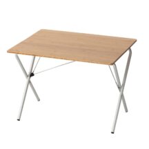 折り畳まれた天板を開閉すると⾃動的に脚が現れる画期的な構造。環境負荷の少ない竹材を採用し、美しく仕上げた天板。そこにかかる荷重をX構造で支えるアルミパイプによりハイスタイルながら抜群の安定性を誇る。