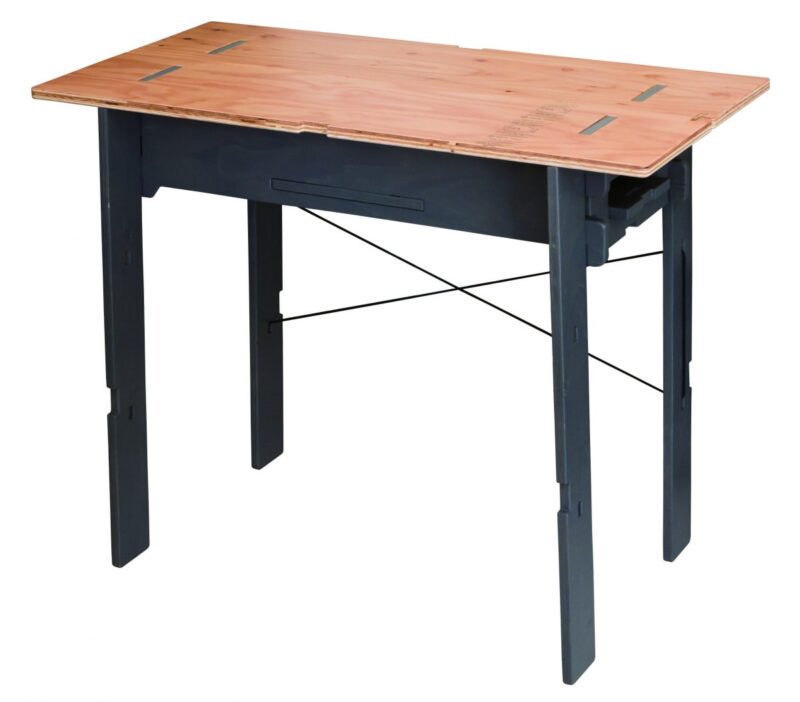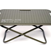ロープで筋交いを作ることにより横揺れに強い構造。天板の下には収納があり、すぐに使わない小物の整理に役立つ。耐荷重は80㎏もあり、天板は90×46㎝と広いので、キャンプだけでなく家庭での使用も視野に入る。使用時はクッキング作業などに便利な高さで、収納時は天板サイズ×厚みは45mm。