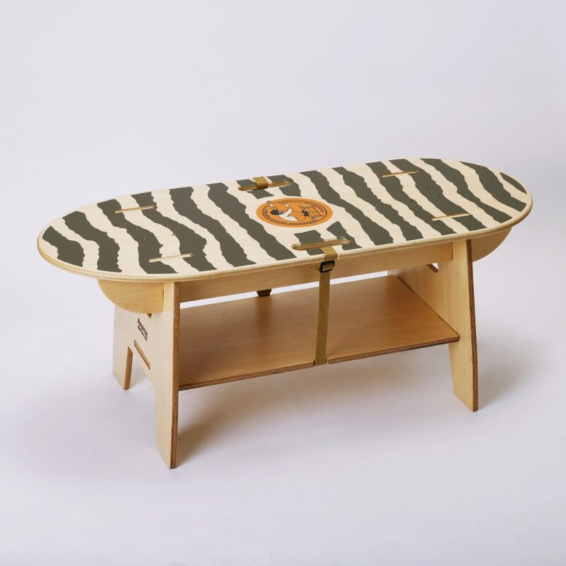 天板はスケートボードをかたどり、カラフルでポップなAlexanderLeeChangオリジナルグラフィックをプリント。天板はひっくり返して杢目だけで使うことも可能。天板下に棚板を設けることで小物を置くスペースを確保。パネルを組み立て、ウェービングテープ留めすることで固定され、揺れや移動に強くなる。